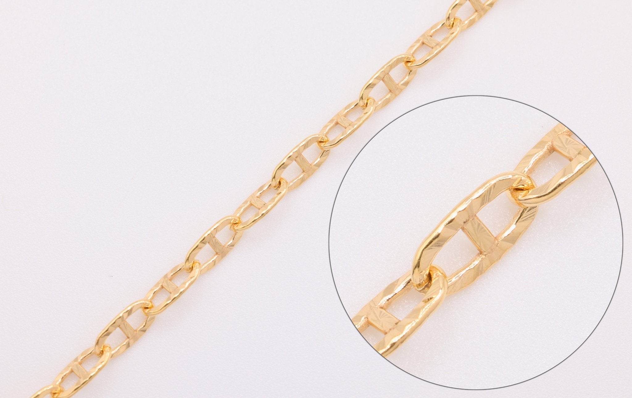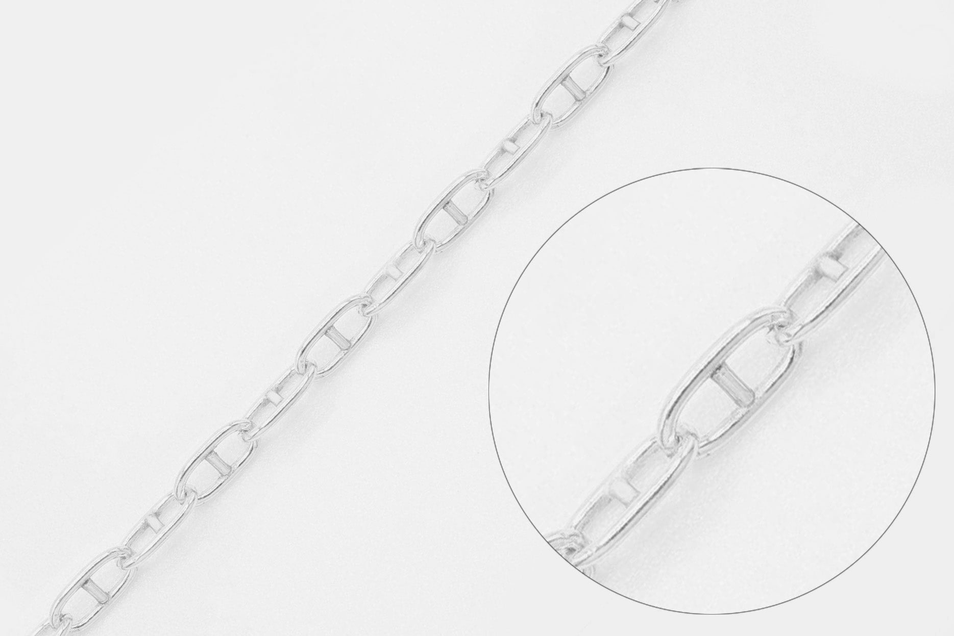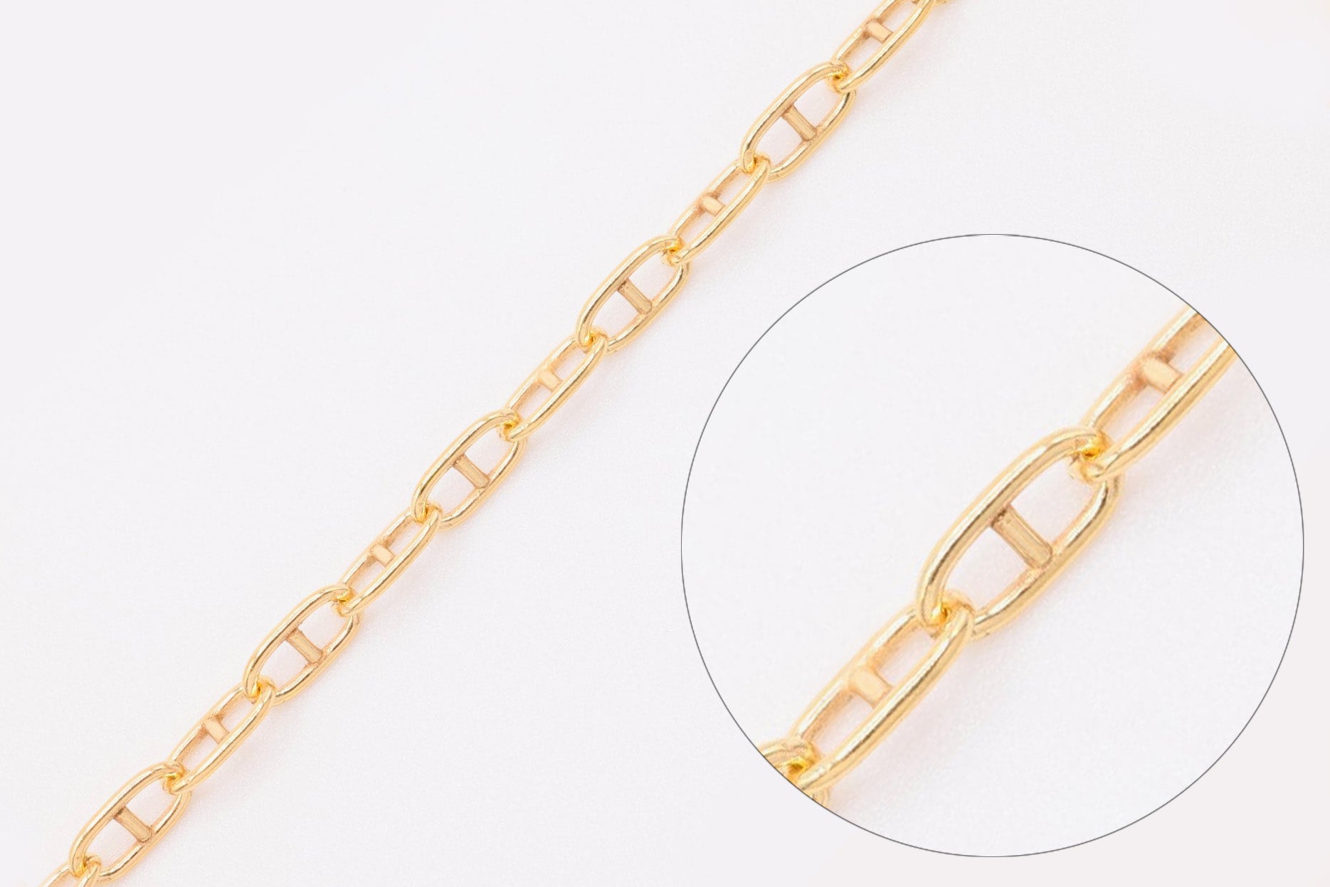Our Anchor Chain, also known as a mariner chain, is a perfect choice for jewelry makers. This chain, inspired by the nautical chain, features a distinctive design similar to chains used to anchor ships. Each link is oval-shaped with a vertical bar running through the middle, giving it a unique and robust appearance. Each link is oval-shaped and has a bar (also known as a vertical stabilizer) across the center. This design is not only aesthetic but also adds strength to the chain.