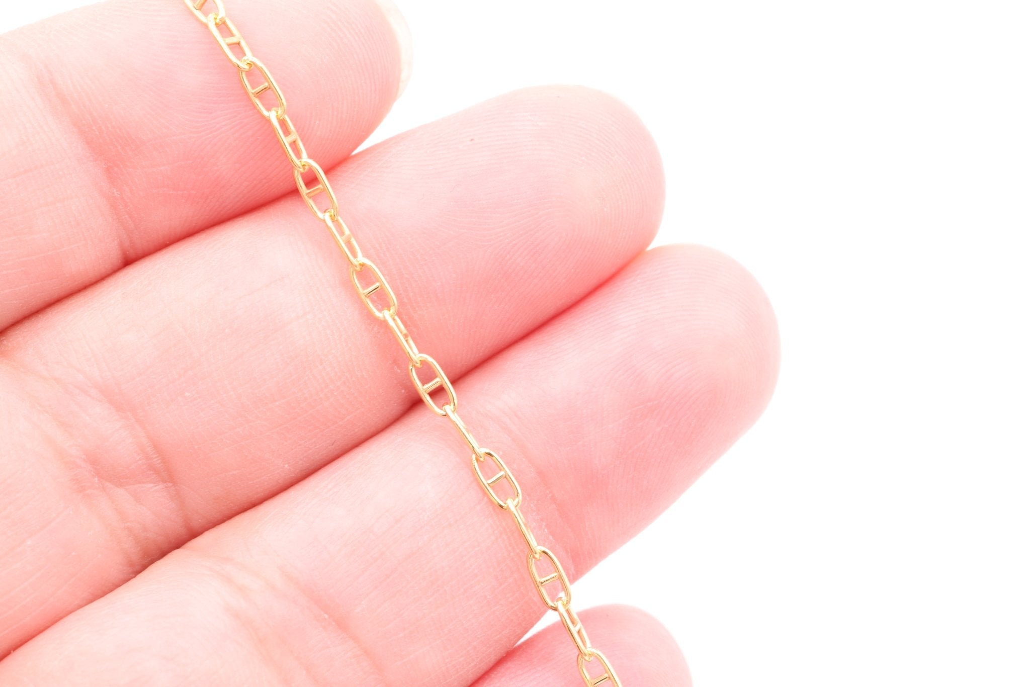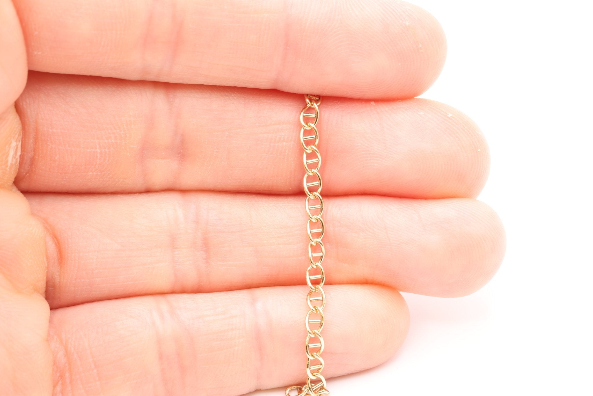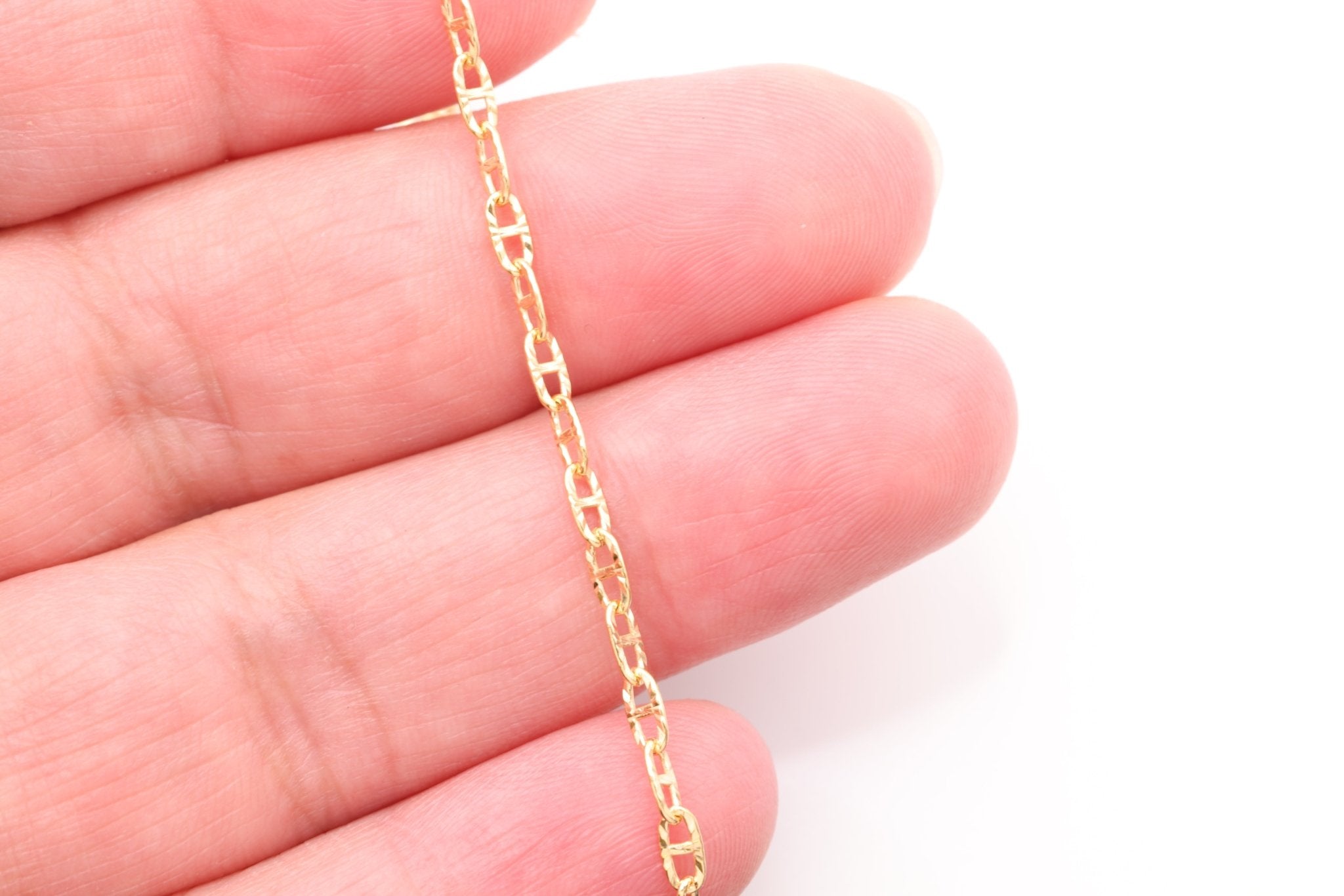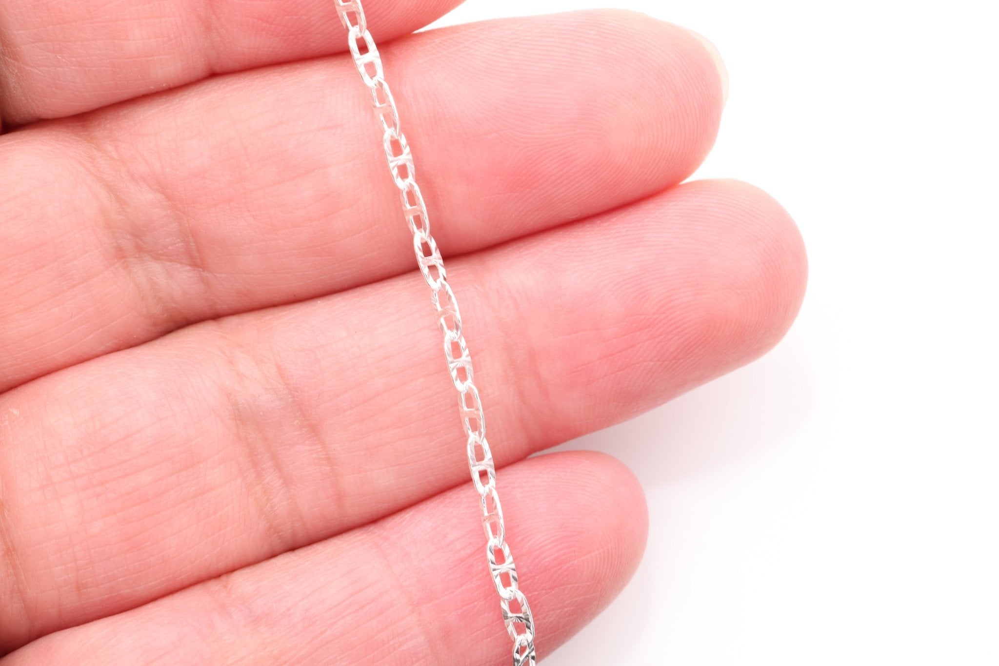 Our Anchor Chain, also known as a mariner chain, is a perfect choice for jewelry makers. This chain, inspired by the nautical chain, features a distinctive design similar to chains used to anchor ships. Each link is oval-shaped with a vertical bar running through the middle, giving it a unique and robust appearance. Each link is oval-shaped and has a bar (also known as a vertical stabilizer) across the center. This design is not only aesthetic but also adds strength to the chain.