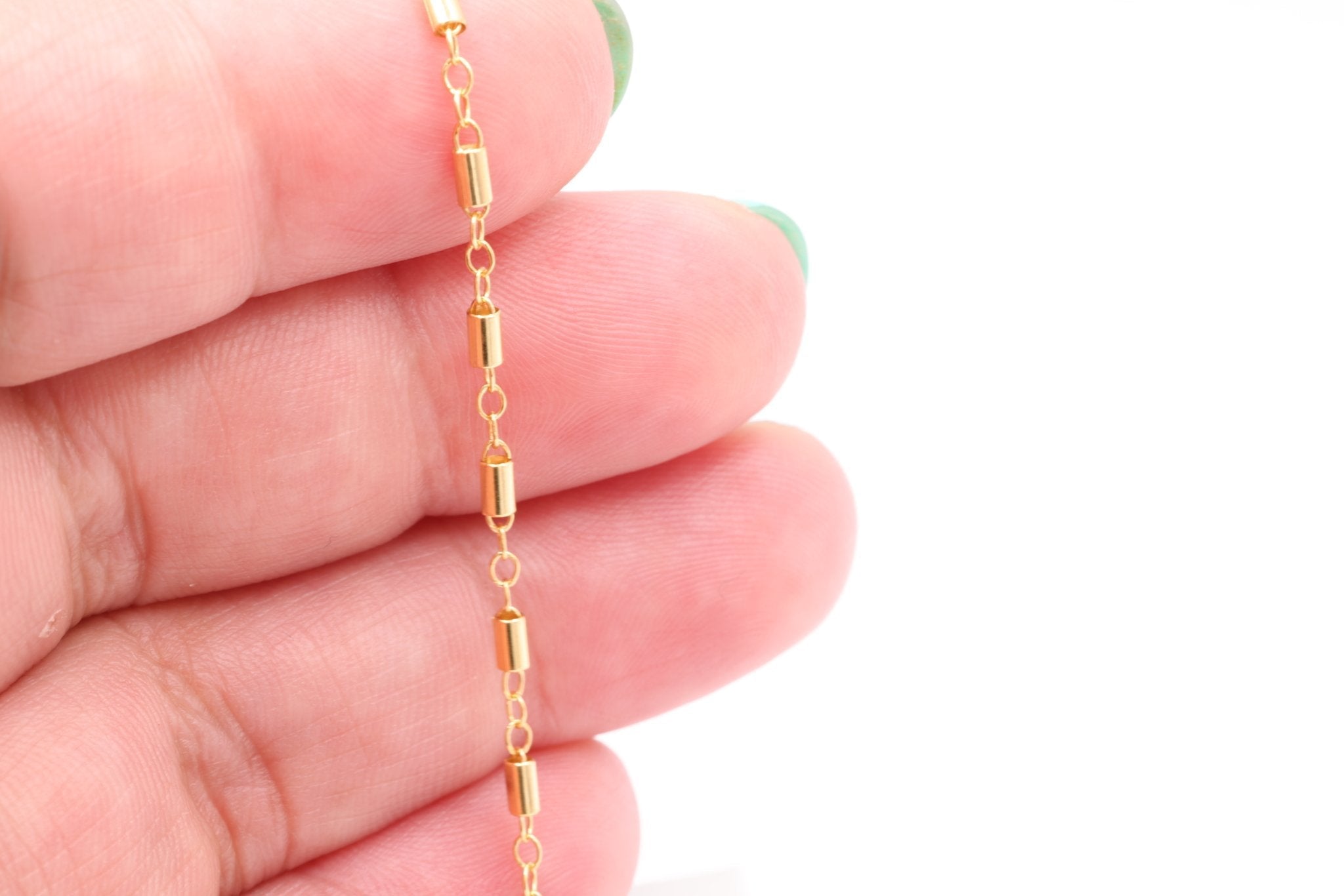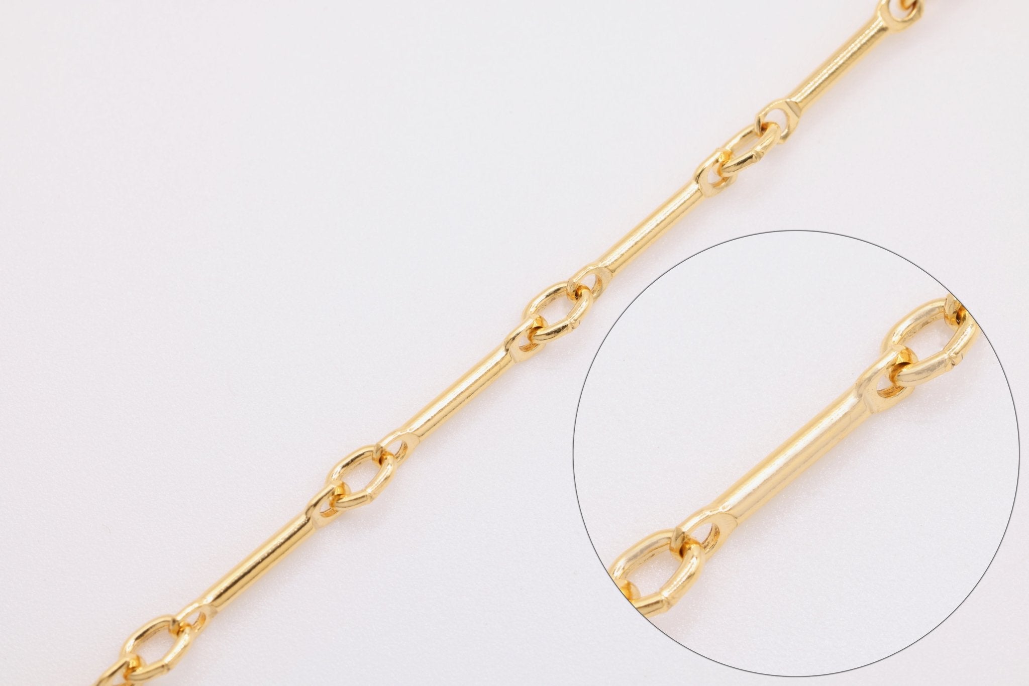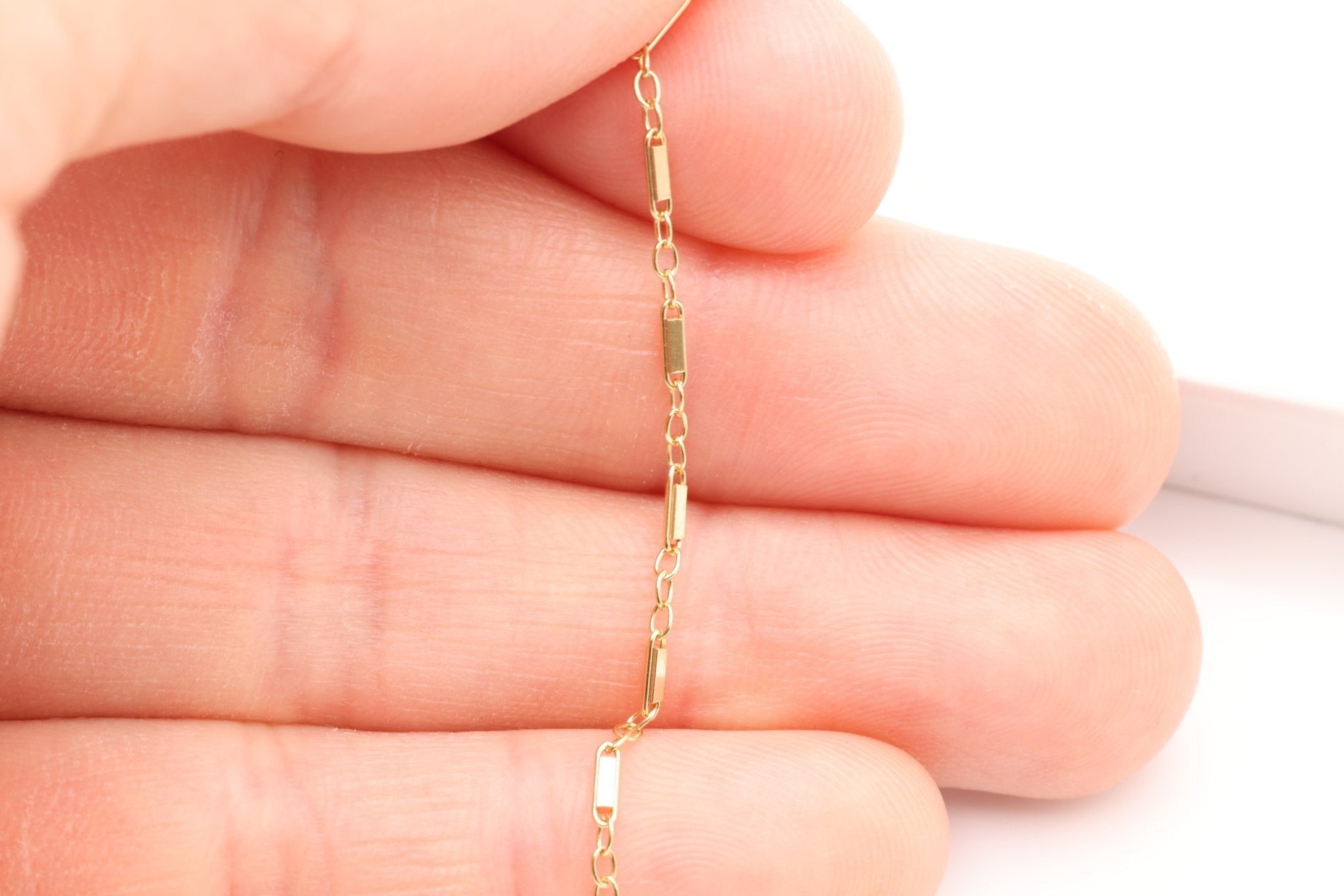 We offer our bar chain in materials such as gold-filled, sterling silver, and other gold plated materials. Bar chains are versatile and can be used in a variety of jewelry pieces, including necklaces, charm bracelets, and earrings. They can be worn alone as a minimalist statement piece or embellished with pendants and charms for a more personalized look. Due to their unique appearance, bar chains are often used in layered jewelry designs, where they can add a distinct textural contrast to other chain types.