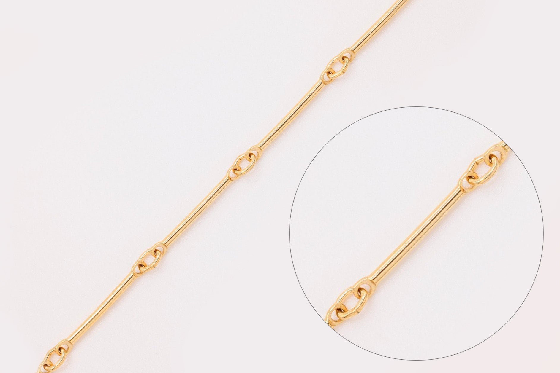 Explore our collection of wholesale Bar Chain for jewelry making. The bar chain is composed of a series of metal bars linked together by shorter lengths of chain or rings. These bars can vary in length, but they are typically straight and uniform in size. The bars are the main feature of the chain and are evenly spaced along its entire length. The bars themselves are usually slender and can be cylindrical, rectangular, or have a flattened appearance. Depending on the design, they may be solid or hollow, and their surface can be plain, textured, or even adorned with engravings or gemstones. The bars are connected by small segments of chain or jump rings, which provide flexibility and movement to the chain. This construction allows the chain to drape fluidly, making it comfortable to wear.