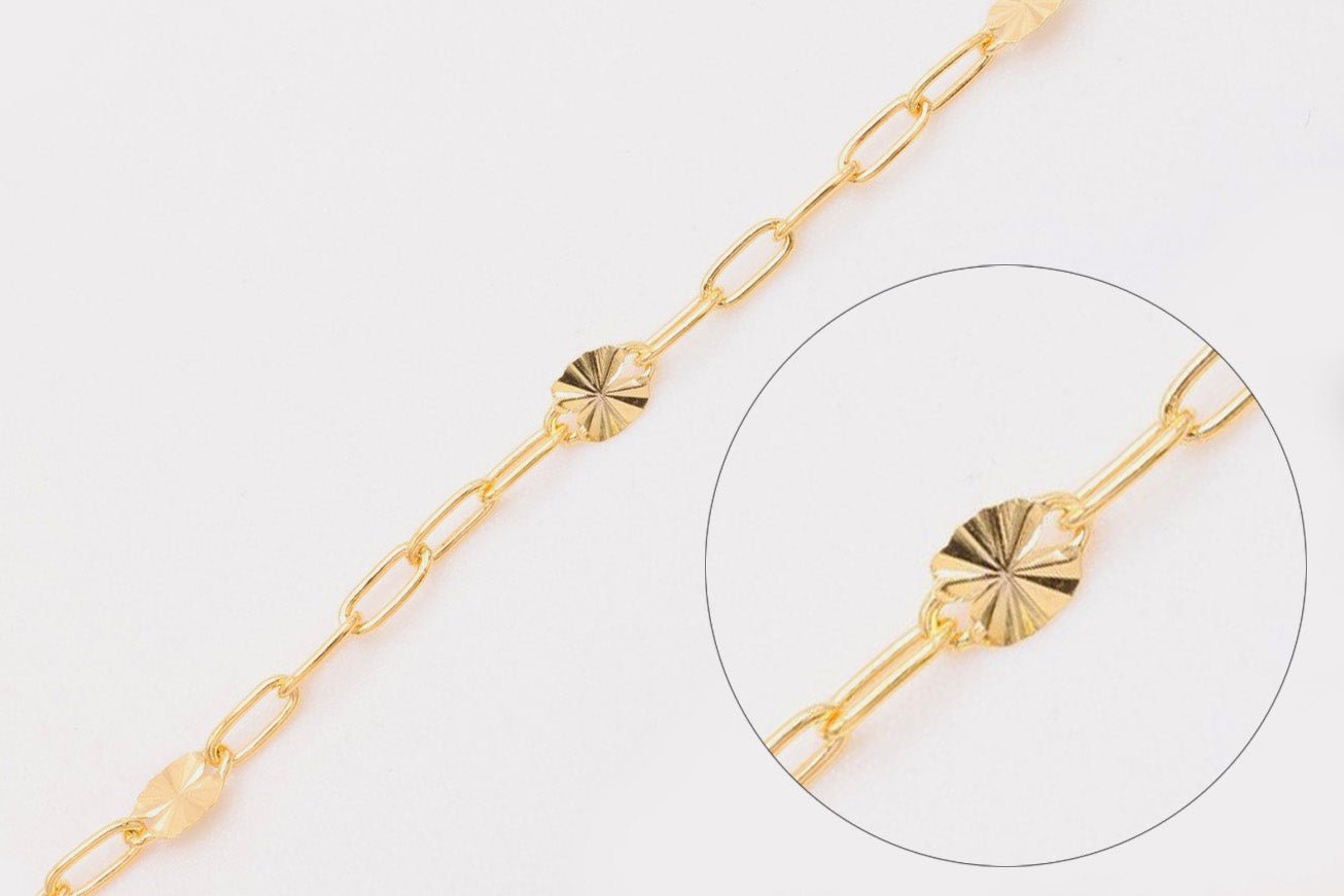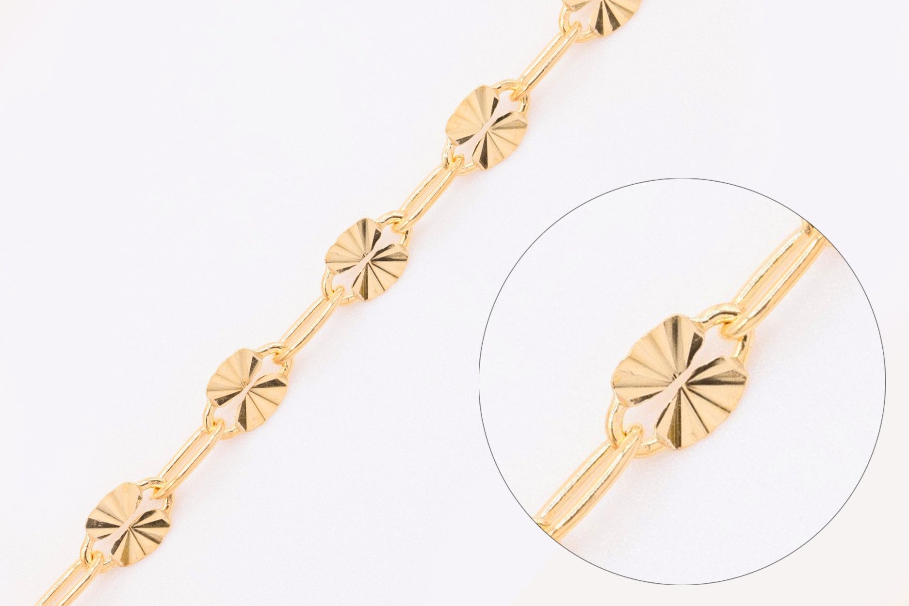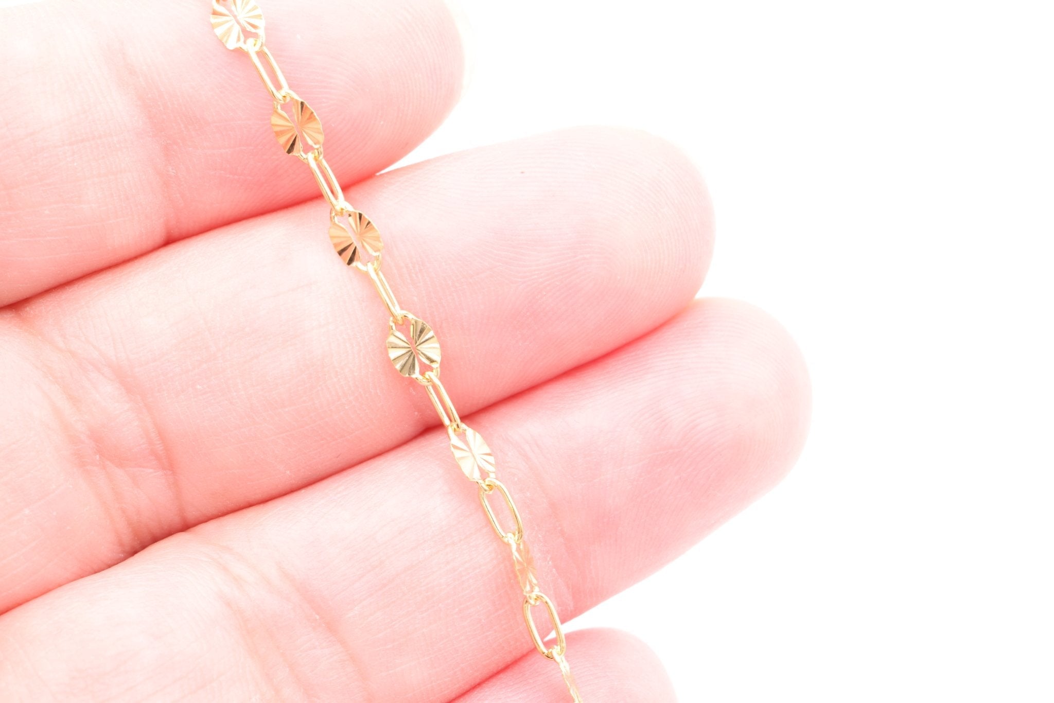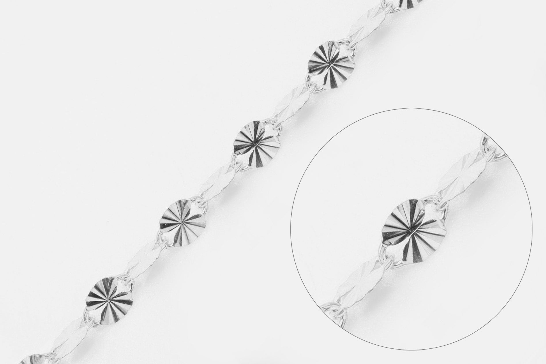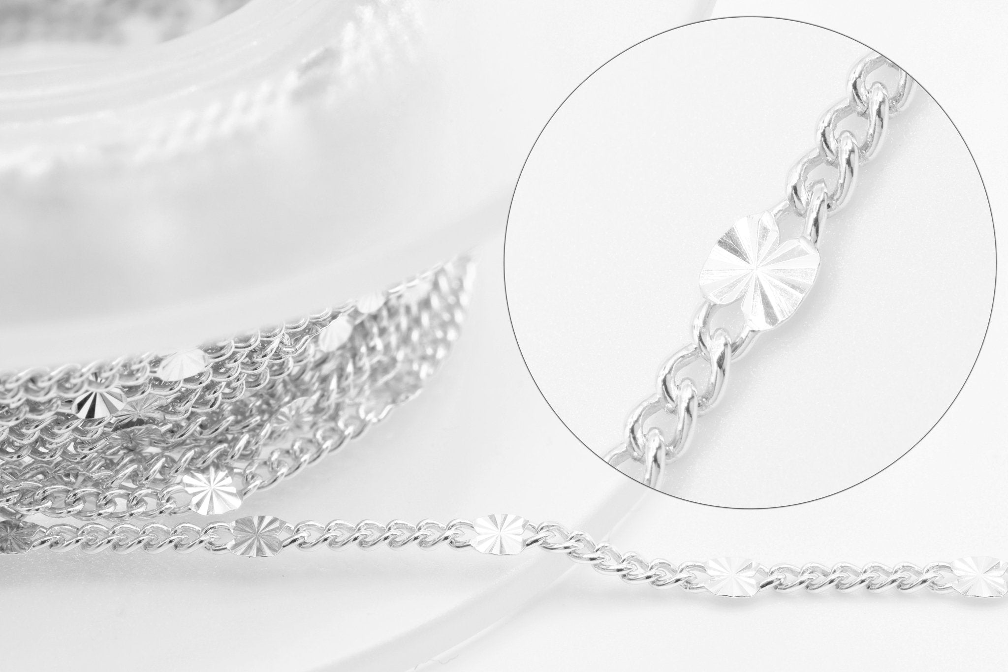 Our starburst chains are beautiful and popular for jewelry making. With its starburst pattern, this chain captures light, creating an eye-catching shimmer that enhances the chain's sparkle. Whether used in necklaces, bracelets, or earrings, the starburst chain provides a distinctive and stylish touch that elevates any piece. Each link of the chain is cut with small, flat surfaces (facets). These facets are designed to catch and reflect light, much like how a diamond sparkles when light hits its surfaces.
