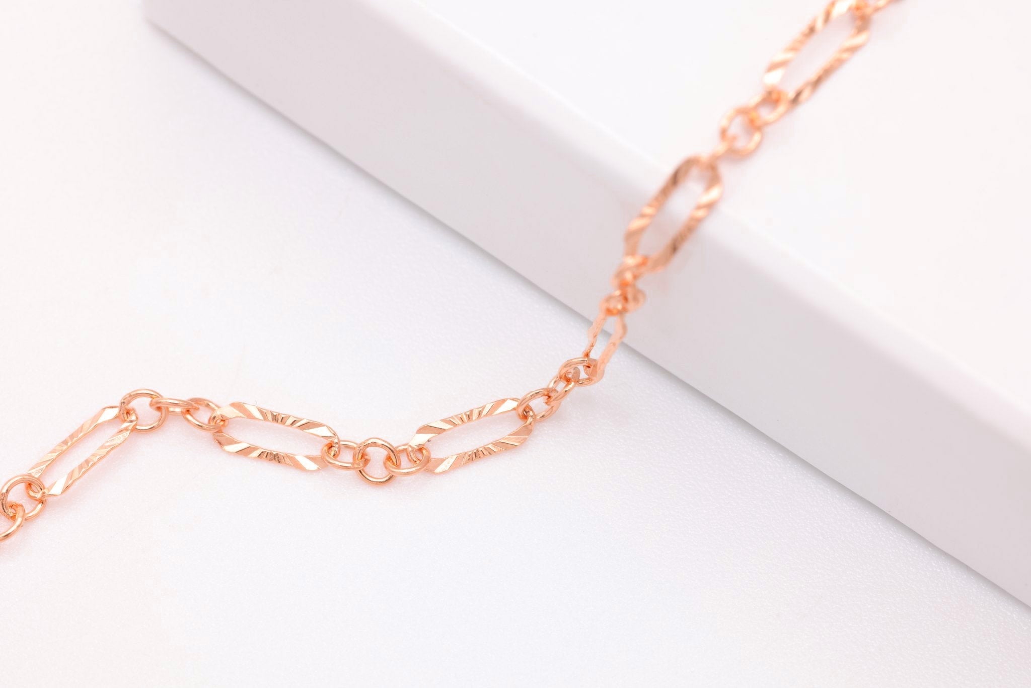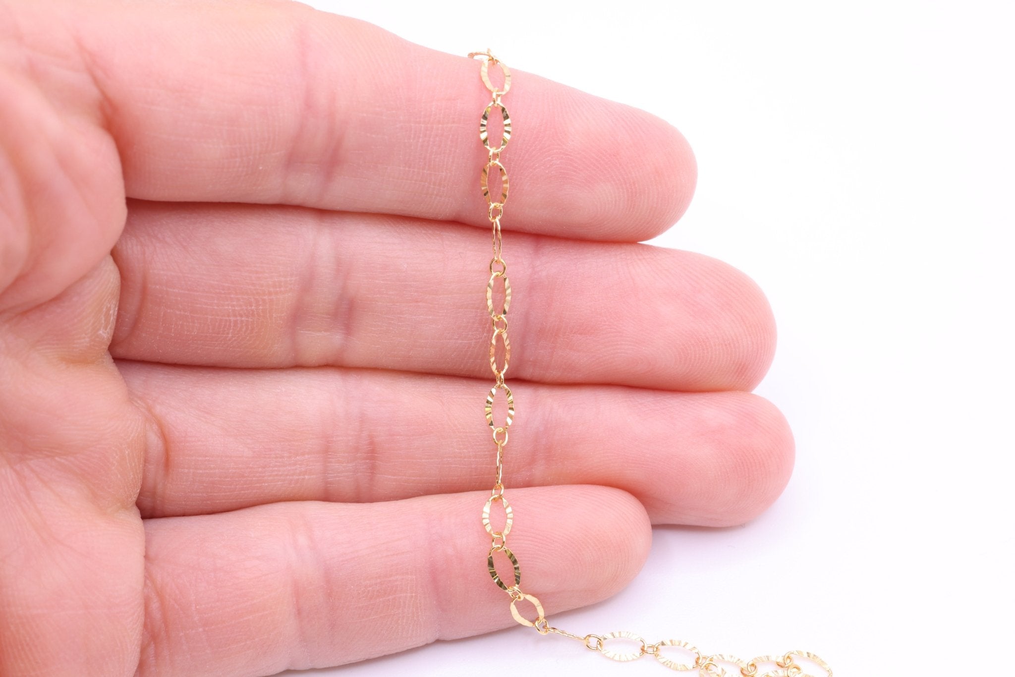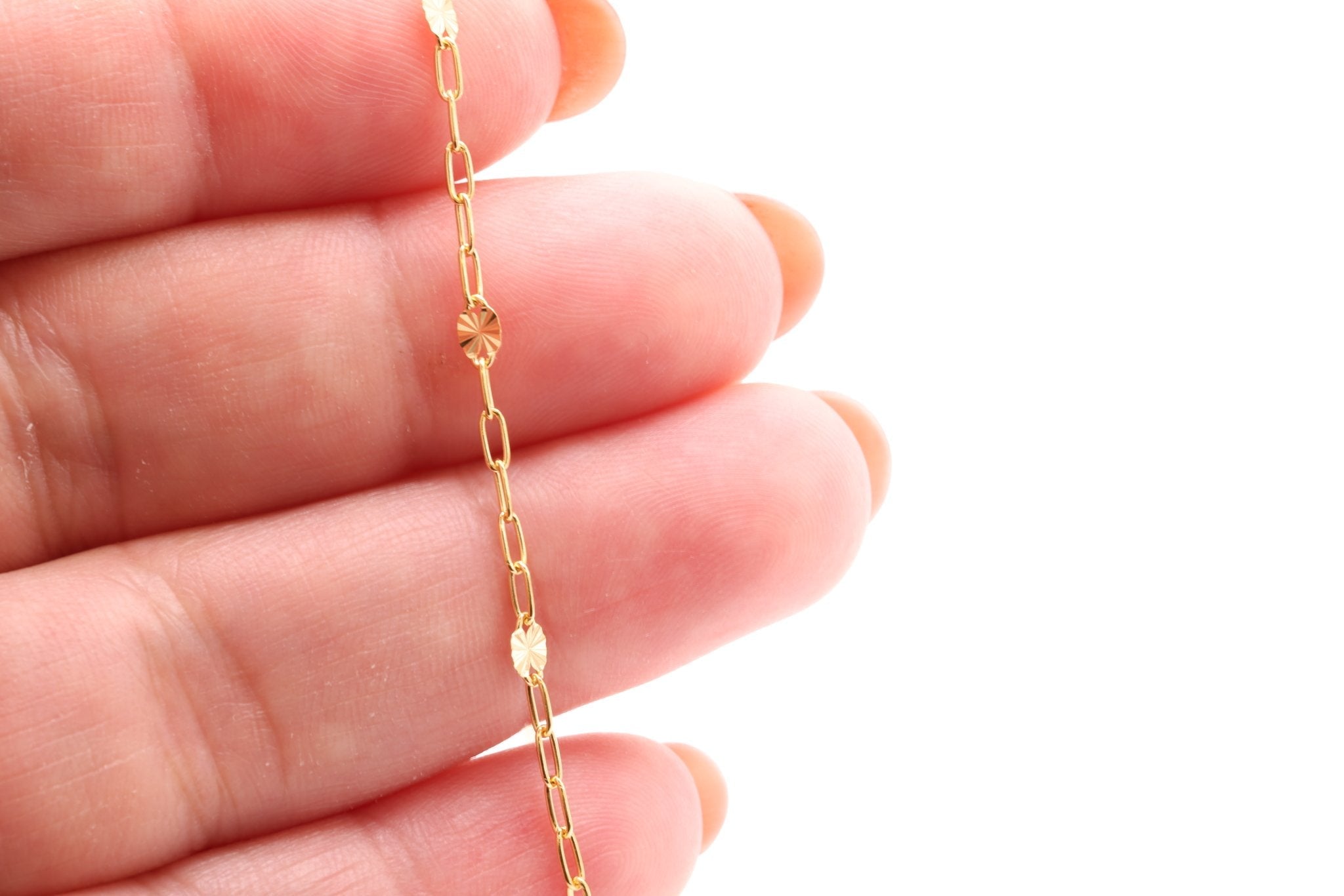 Our starburst chains are made in several materials, such as gold-filled, sterling silver, and other materials. The starburst design can be applied to various styles of chains, such as rope, curb, figaro, or box chains. The faceting can be fine and subtle or more pronounced, depending on the desired effect and the style of the chain. They can serve as beautiful standalone pieces or can be adorned with pendants and charms.