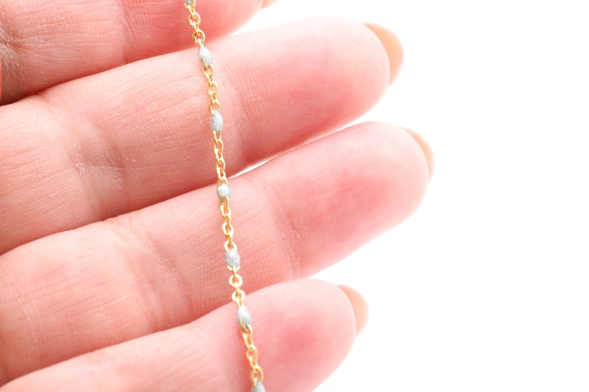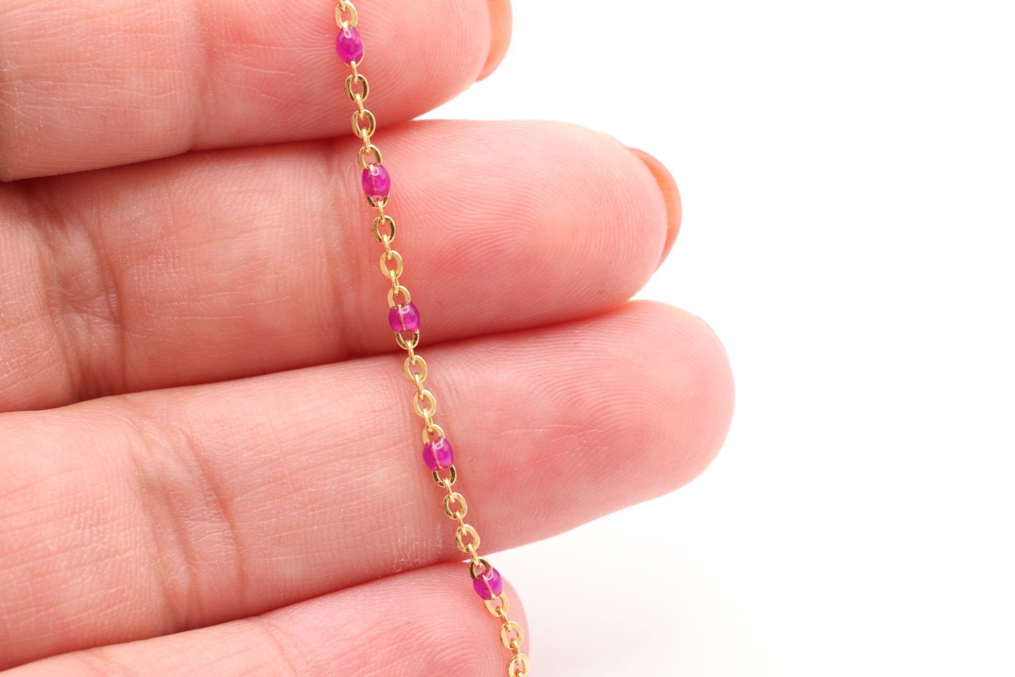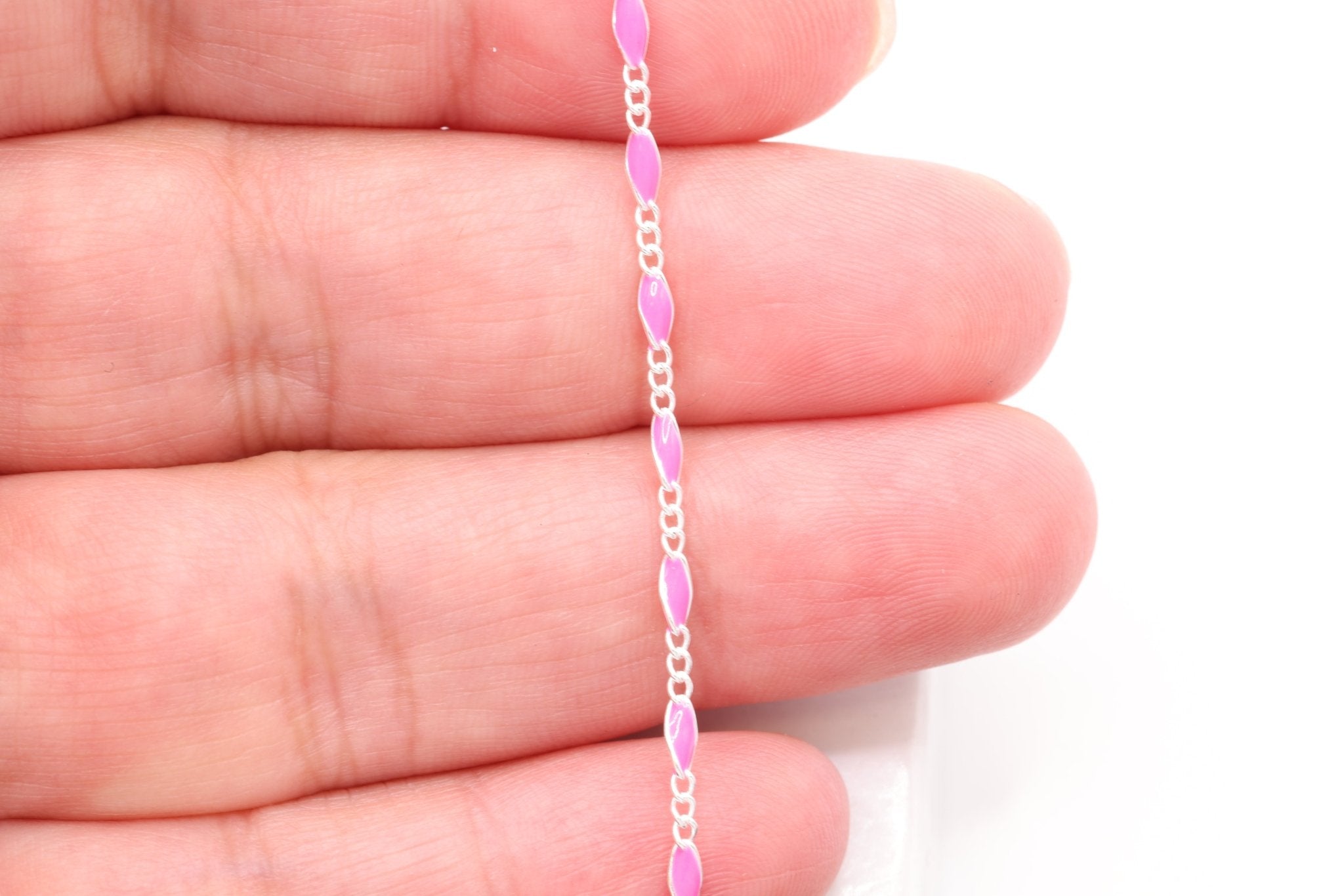 Explore our wholesale collection of Enamel Chain for jewelry making. Perfect for jewelers looking to add a splash of color and uniqueness to their jewelry. Each chain in our collection features high-quality links, coated with a durable, glossy enamel finish. This enamel layer not only brings a burst of color but also adds a smooth, lustrous surface to each link, enhancing the chain's overall aesthetic. Available in a rainbow of colors, from classic hues to bold, contemporary shades, our enamel chains are ideal for crafting eye-catching necklaces, bracelets, and anklets.