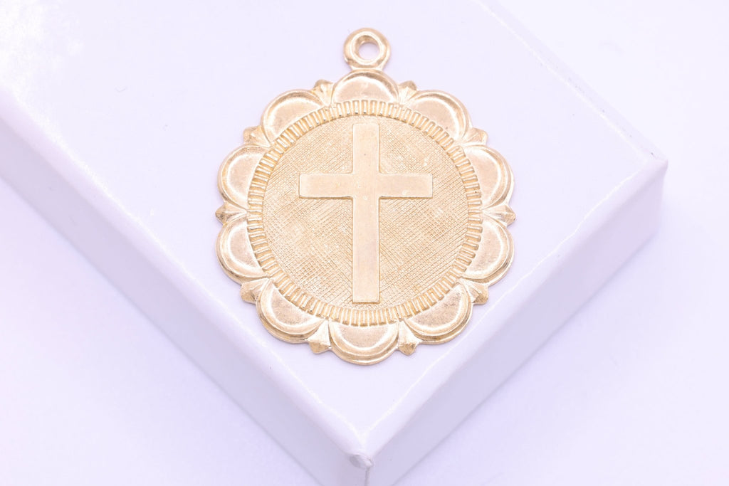 Scalloped Edge Round Cross Pendant Charm, Wholesale, 14/20 Gold-Filled, 21mm, Religious