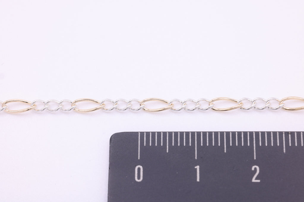 2.5mm x 6mm Figaro Two Tone Chain, 14/20 Gold-Filled and 925 Sterling Silver, Wholesale, Pay Per Foot, 3 & 1 Link Jewelry Making Chain